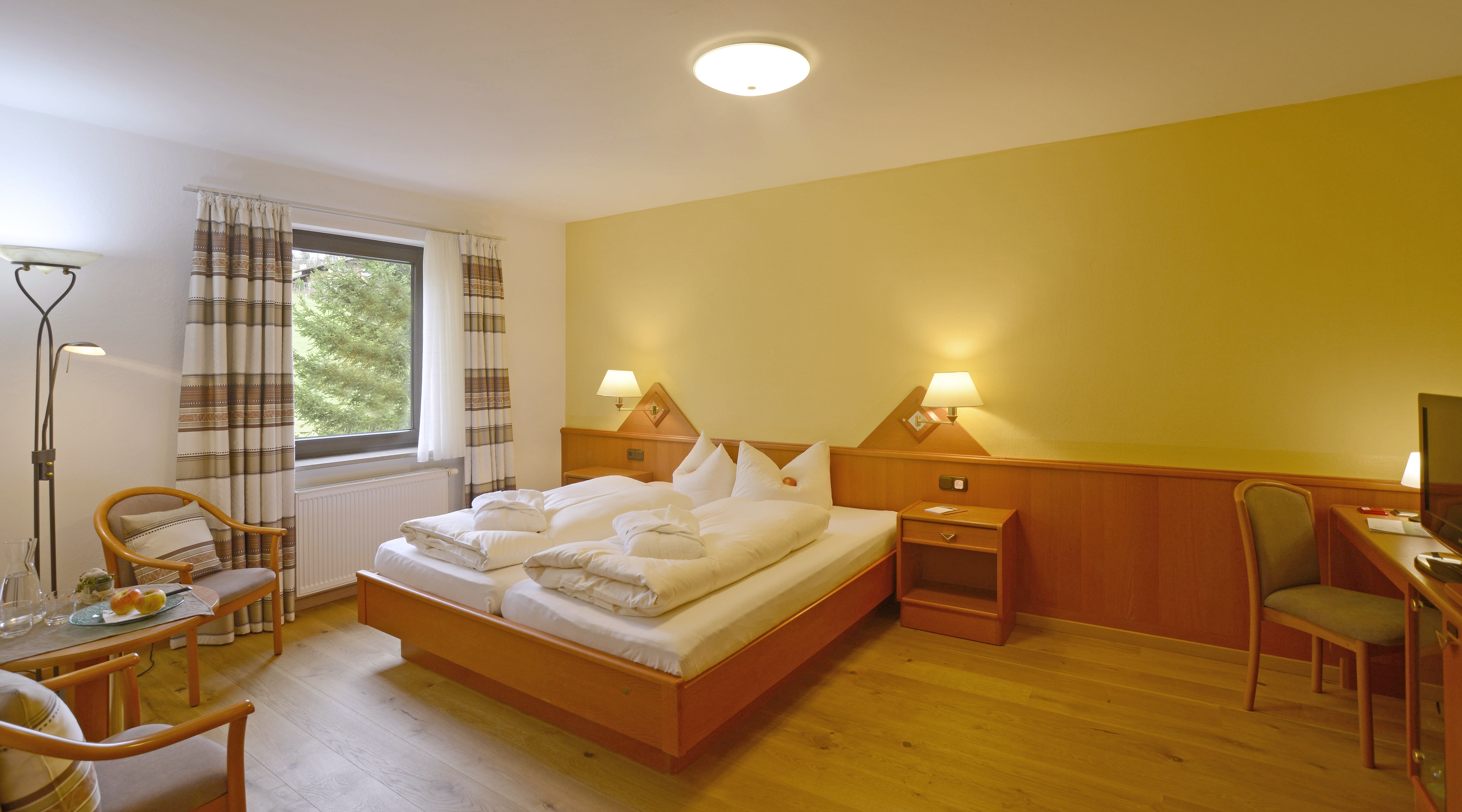 Wohn-Schlafzimmer mit Naturholzboden ohne Balkon zur Nordseite mit Blick zur Bergwiese.